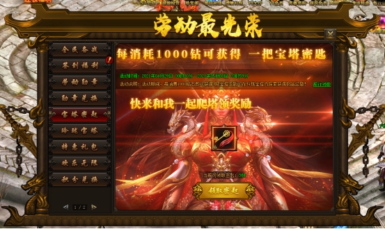 活动内容:活动期间,每消费1000钻石即可获得1把宝塔密匙可在玲珑宝塔内探索获得极品奖励!