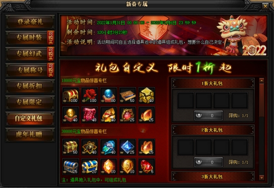 4)自定义礼包--活动期间可自主选择道具池中的道具组成礼包,超低折扣随心选购