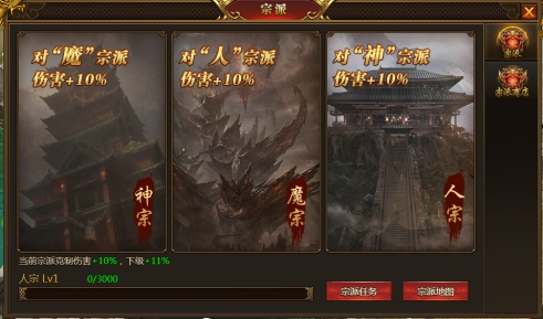 2. 3个宗派相互克制,加入即生效,人宗对神宗增伤,神宗对魔宗增伤,魔宗对人宗增伤,宗派等级越高,增伤越明显。