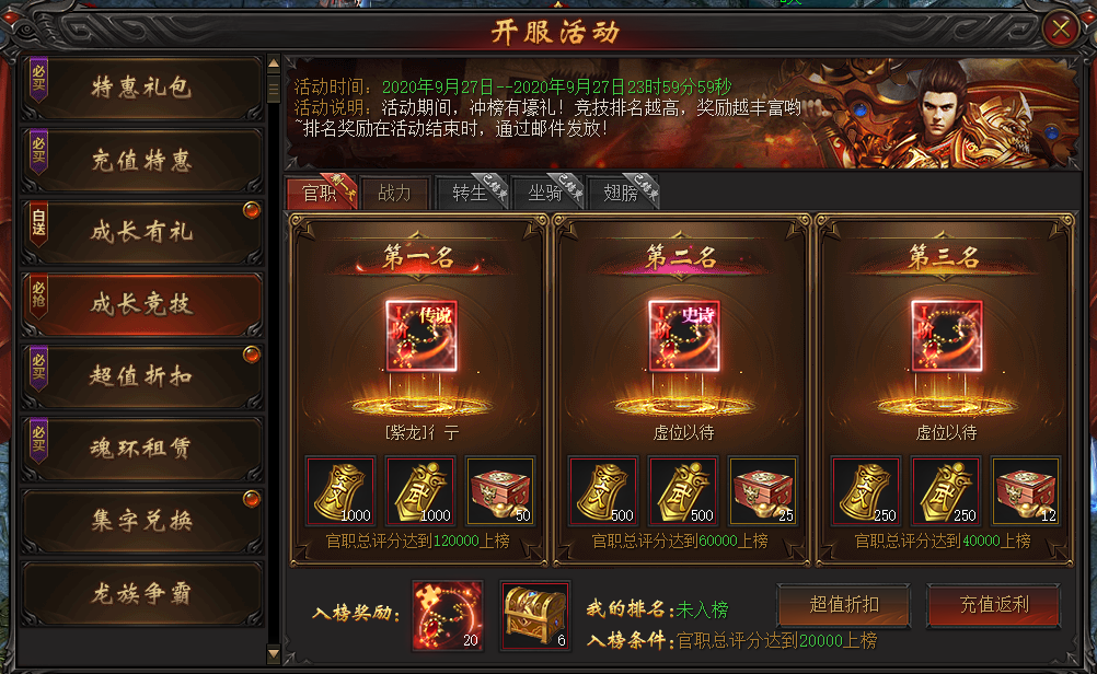 说明:开服第四天,活动期间官职总评分满足条件即可上榜,最终排名越高奖励越丰富