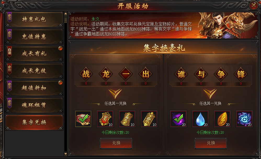 活动说明:每日通过击杀BOSS收集“战龙一出 谁与争锋”文字道具,即可在界面兑换稀有道具!