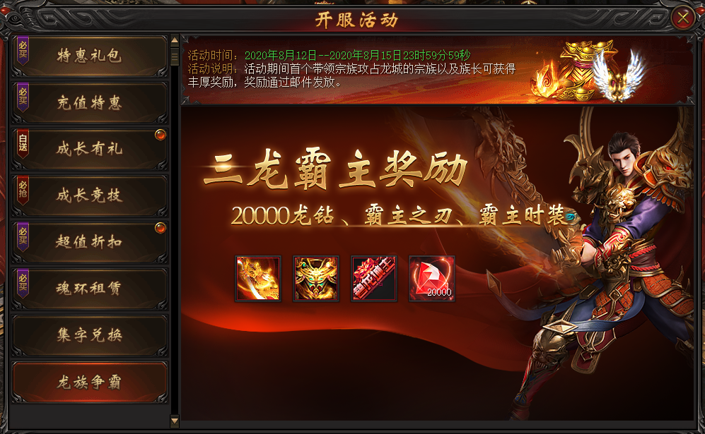 活动说明:开服第四天,开启“龙城争霸”活动,需报名后参与。开服首次龙城称霸的占领帮会以及帮主可获得丰厚奖励,奖励通过邮件发放!