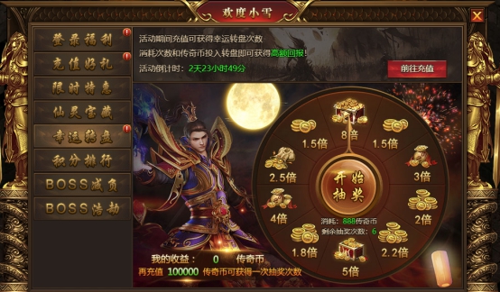 1.活动期间充值可获得幸运转盘次数,消耗转盘次数和传奇币投入转盘可获得高额回报