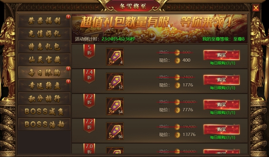 活动内容:活动期间消耗传奇币即可购买特惠礼包