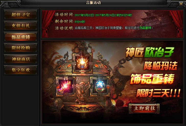 活动期间,神匠欧冶子现身盟重,前往可进行饰品重铸!